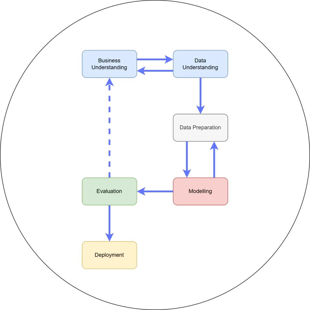 Doch wie geht man eigentlich vor, wenn man im Unternehmen ein KI-Projekt starten möchte? Das CRISP-DM-Modell (Cross-Industry Standard Process for Data Mining) liefert hierfür einen bewährten Fahrplan in sechs Phasen, den wir hier Schritt für Schritt erläutern. Ergänzend zu CRISP-DM können weitere Ansätze wie agile Methoden für iteratives Projektmanagement in Betracht gezogen werden, um Flexibilität im Projektverlauf zu gewährleisten und eine kontinuierliche Anpassung an neue Erkenntnisse und Anforderungen zu ermöglichen.